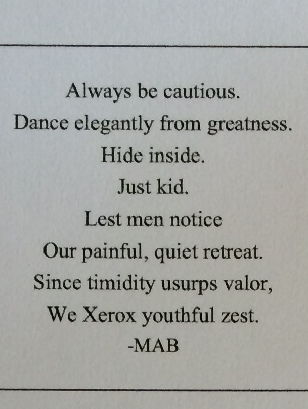 I had been thinking for some time of putting the Abecedarian Sequences into a visual art form. It was serendipity then. My little writing club spun two sequences of their own and I got permission from them to use them here. They are indicated by the initials MAB and BKSA. I harvested the six that I had already published on 1874. That makes eight. I cranked out three more sequences last night and a last one this morning.
