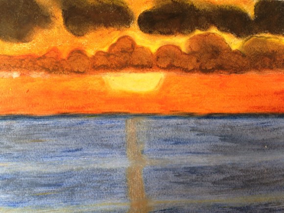 Tales from the WagginMaster inspired another oil pastel with his beautiful photographs of a sunrise in my once hometown of Corpus Christi, Texas.