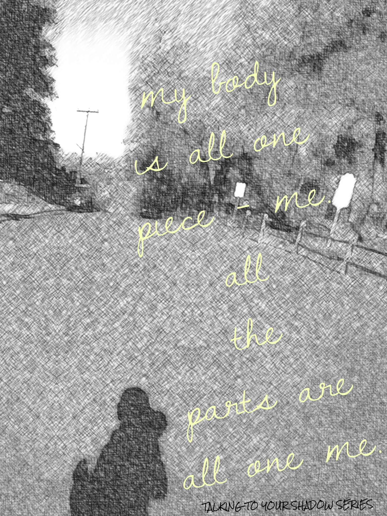 The first in the series gives some background on what I’m trying to do. When I run, the three parts of me interact very loudly. These are photographs taken by me and edited with Enlight and WordSwag. They are a two dimensional way to capture one second of my three parts loudly interacting.