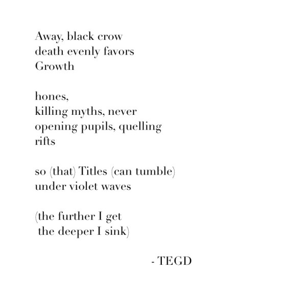 Categories Poetry like (abecedarian no. 24) Borne from “death”. Post author By TEGD Post date February 9, 2018 No Comments on (abecedarian no. 24) Click to email a link to a friend (Opens in new window) Email Like Loading... Related Tags abecedarian, acrostic, elegy, poem, poetry, writing By TEGD I write abecedarian sequences View Archive → ← (abecedarian no. 23) → (abecedarian no. 25) Leave a comment Cancel reply Δ