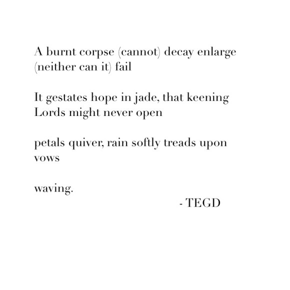 An abecedarian sequence is, ideally, a 26-word poem, each word in alphabetical order. This one born out of “a burnt corpse” (A-B-C)