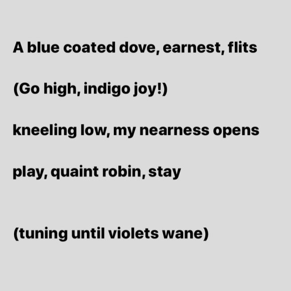 Categories Poetry like A blue coated dove, a quaint robin For my mother and brother. Post author By TEGD Post date December 20, 2019 No Comments on A blue coated dove, a quaint robin Click to email a link to a friend (Opens in new window) Email Like Loading... Related Tags abecedarian, abecedarian sequence, creativewriting, joy, poem, poems, poetry, writing By TEGD I write abecedarian sequences View Archive → ← If there are 2, there are 3 → Horses and Cars Leave a comment Cancel reply Δ