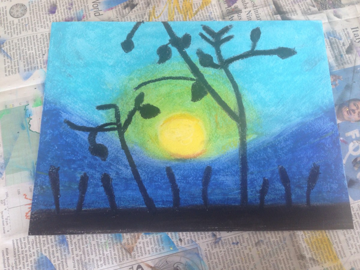 One of my favorite bloggers, Stock Research 52, posted another inspiring photograph of a sunrise in his home of Bangalore, India earlier in March. I tried to paint it in pastels last week.